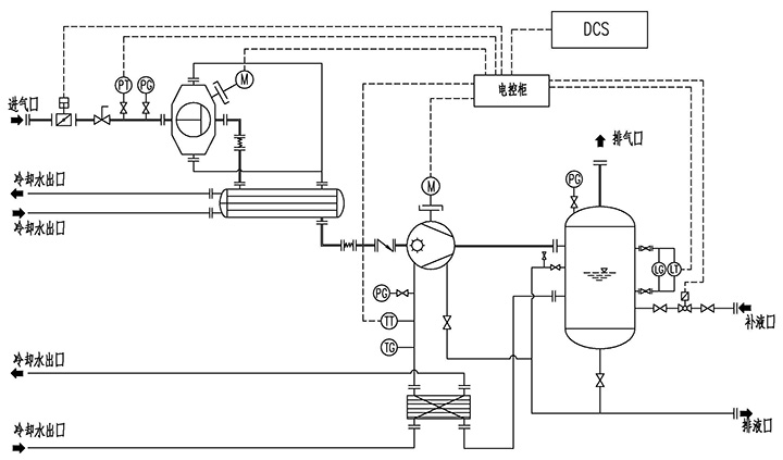 具體的思路為,不改變?cè)b置中的水環(huán)式抽真空系統(tǒng)的設(shè)備及功能,在抽真空主管道上并接一套羅茨水環(huán)高效真空機(jī)組。在機(jī)組啟動(dòng)建立真空期間,首先由原裝置水環(huán)式抽真空系統(tǒng)進(jìn)行快速預(yù)抽,以達(dá)到啟動(dòng)真空,在正常運(yùn)行保持真空階段,使用羅茨水環(huán)高效真空機(jī)組進(jìn)行維持真空。