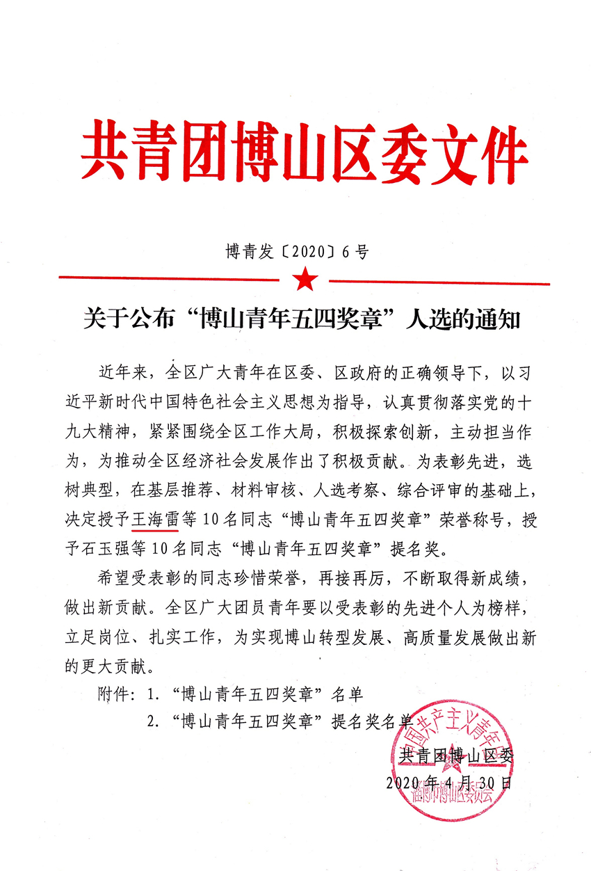 2020年4月30日,共青團淄博市博山區(qū)委員會組織召開了“綻放戰(zhàn)役青春  堅定制度自信”主題宣講暨優(yōu)秀青年事跡分享會。區(qū)委常委、組織部部長楊發(fā)磊,副區(qū)長李林出席會議。會上授予我公司員工王海雷等10名同志“博山區(qū)青年五四獎?wù)隆睒s譽稱號。