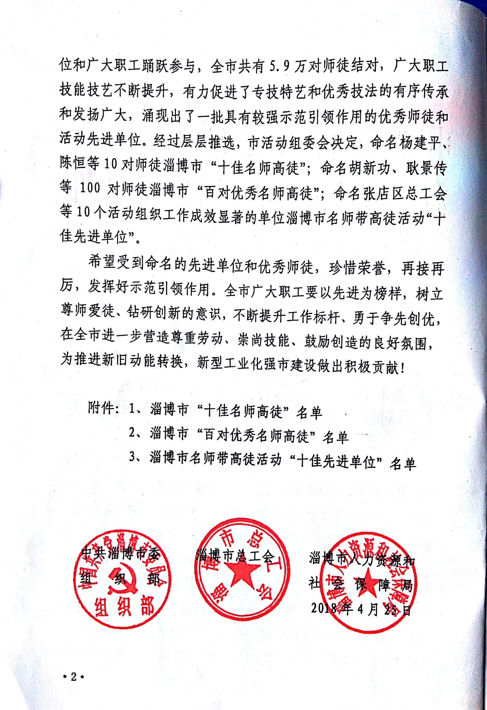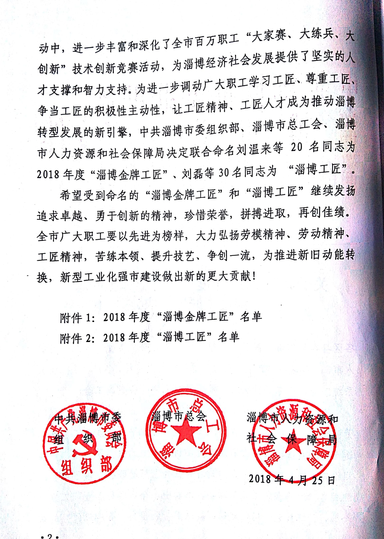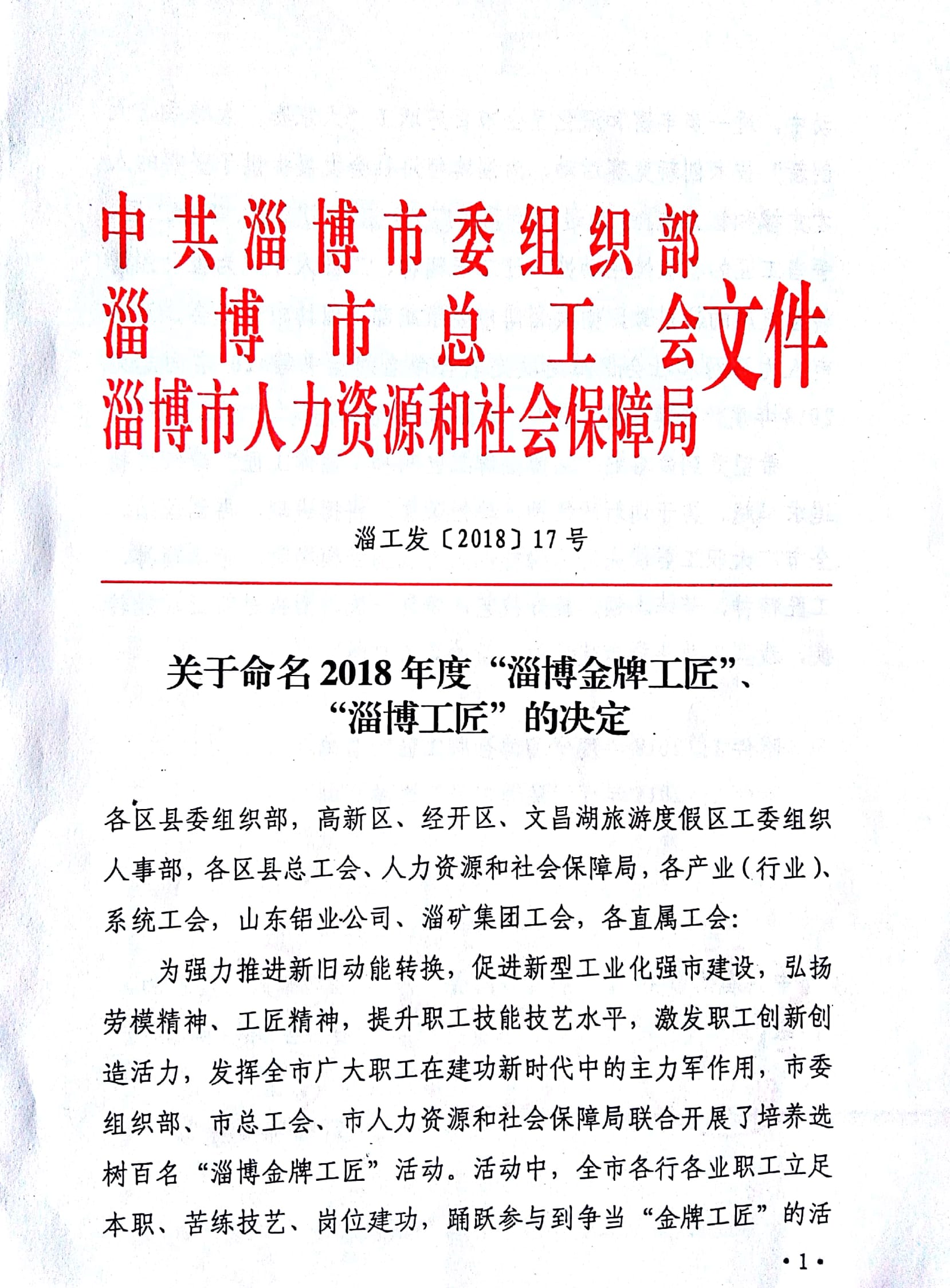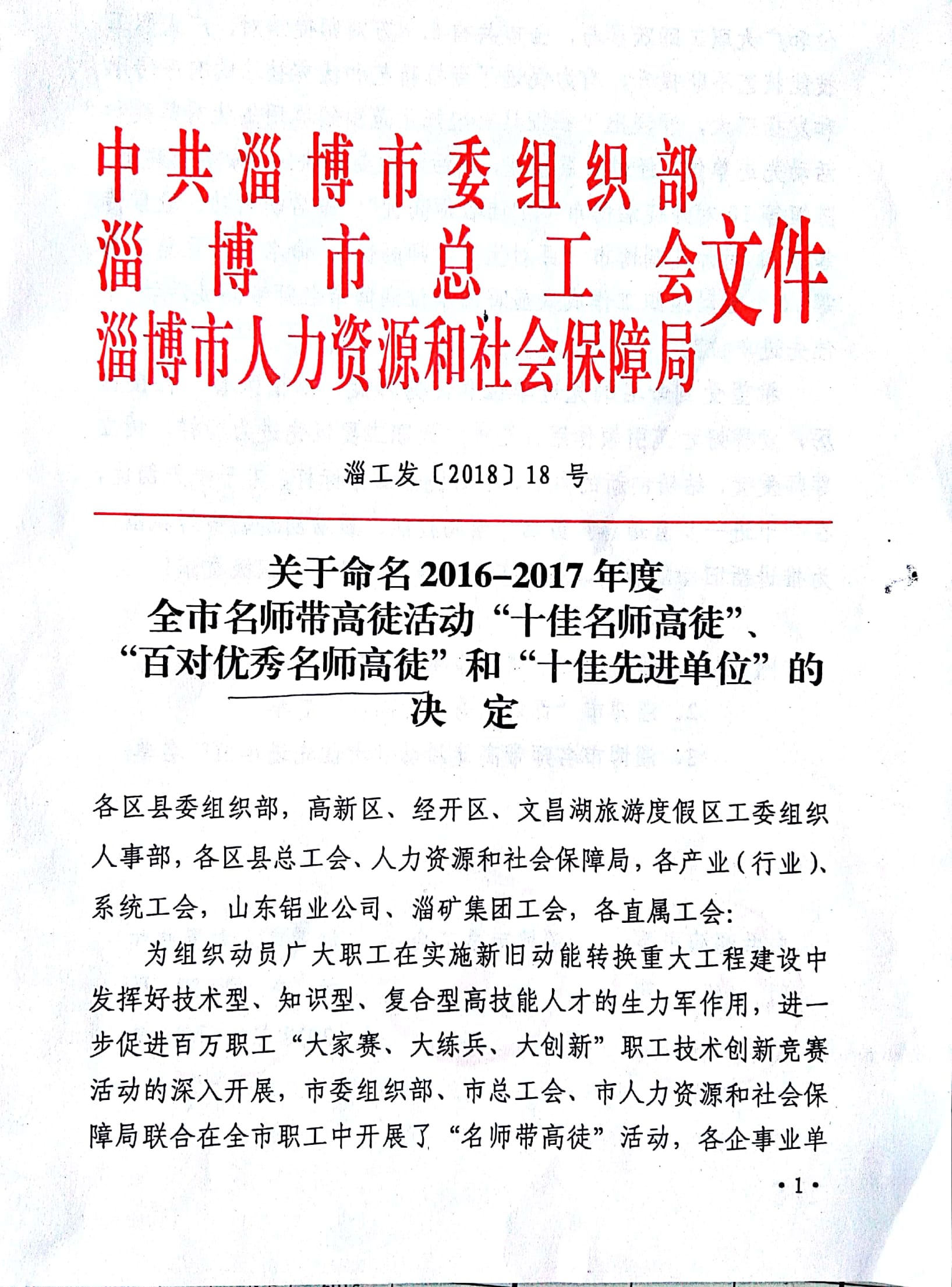 為了推進我市新舊動能轉(zhuǎn)換,促進新型工業(yè)化強市建設(shè),弘揚勞模精神、工匠精神,使百萬職工“大家賽、大練兵、大創(chuàng)新”技術(shù)創(chuàng)新競賽活動深入開展,發(fā)揮全市廣大職工在建功新時代中的主力軍作用,市委、市政府多個部門聯(lián)合在全市開展了“尋找身邊的淄博工匠”和“名師帶徒”活動。經(jīng)過層層推薦、網(wǎng)絡(luò)公示評選、組委會考核評定,我公司被命名為淄博市名師帶徒活動“十佳先進單位”;員工劉立新被授予“淄博工匠”榮譽稱號;命名公司員工錢文革、劉龍根、王新艷、丁燁為“淄博市百對優(yōu)秀名師高徒”。