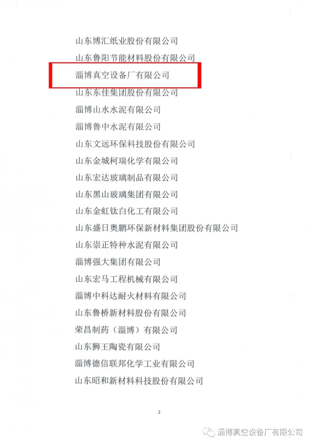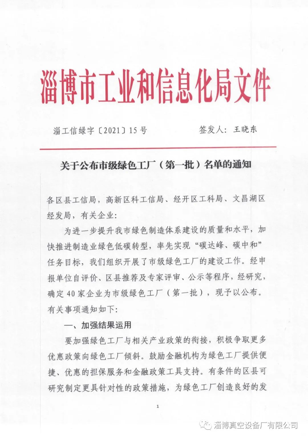 淄博真空設備廠有限公司獲得淄博市第一批“綠色工廠“榮譽稱號”