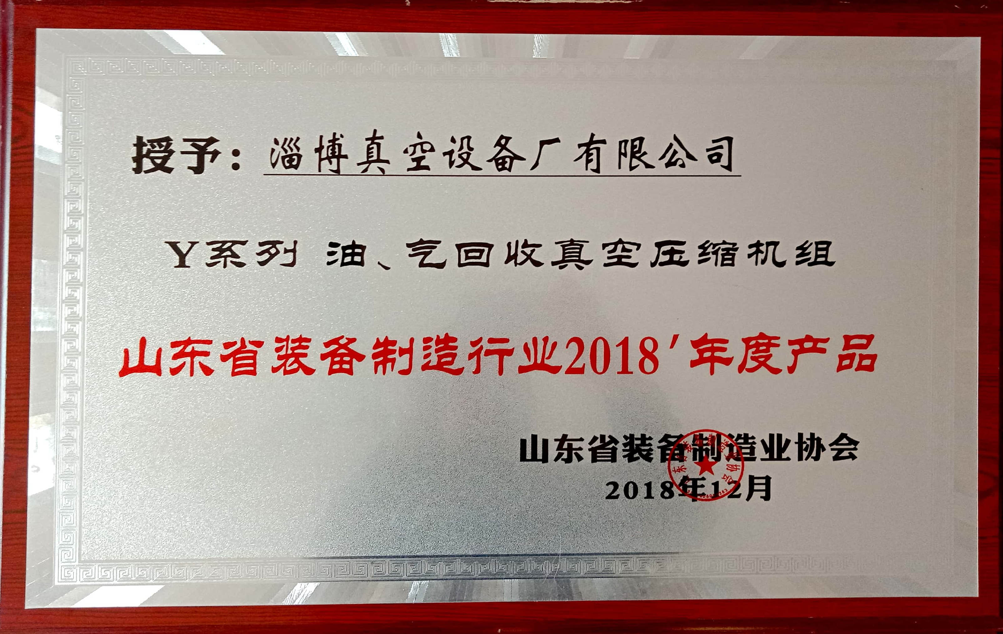 淄博真空設(shè)備廠有限公司被授予“山東省裝備制造行業(yè)優(yōu)秀企業(yè)”、“優(yōu)秀會(huì)員企業(yè)”,公司董事長(zhǎng)黃毅同志被授予“山東省裝備制造業(yè)優(yōu)秀企業(yè)家”; 公司產(chǎn)品Y系列油、氣回收真空壓縮機(jī)組獲2018山東省裝備制造行業(yè)年度產(chǎn)品。