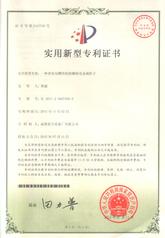 “一種帶有溝槽結構的鑲鑄雙金屬轉子”獲實用新型專利證書