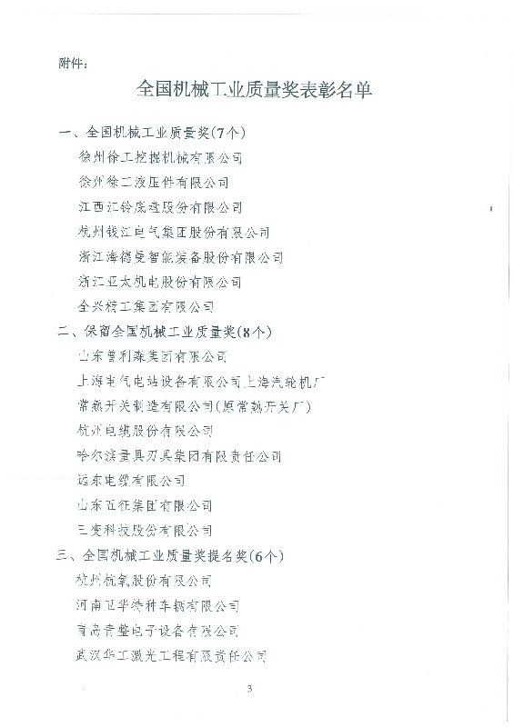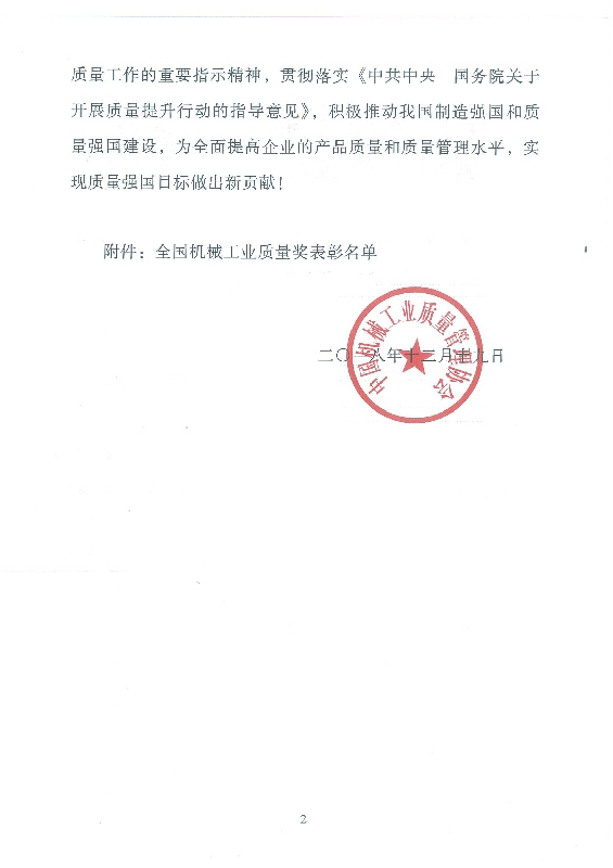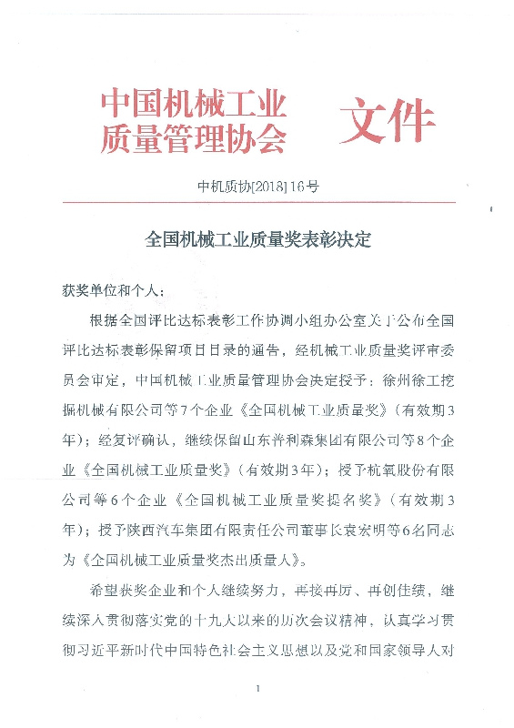 2018年12月19日至20日,中國(guó)機(jī)械工業(yè)質(zhì)量管理協(xié)會(huì)七屆五次理事擴(kuò)大會(huì)議在徐州舉行。會(huì)議對(duì)在機(jī)械工業(yè)質(zhì)量管理中作出優(yōu)異成績(jī)的先進(jìn)企業(yè)和優(yōu)秀個(gè)人進(jìn)行了表彰,公司董事長(zhǎng)黃毅同志被授予“全國(guó)機(jī)械工業(yè)質(zhì)量獎(jiǎng)杰出質(zhì)量人”榮譽(yù)稱號(hào)。